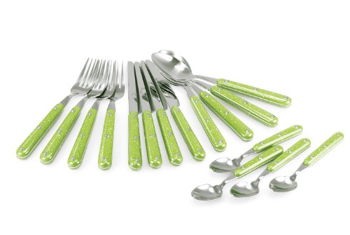 Description : Stabiles Besteckset aus Edelstahl mit fest aufgenieteten Kunststoff-Schalen im Design der jeweiligen klassischen Emaille Geschirre (blau und grün). Je 4 Stück Löffel, Gabel, Messer und Teelöffel. Sehr gute Haushaltsqualität.